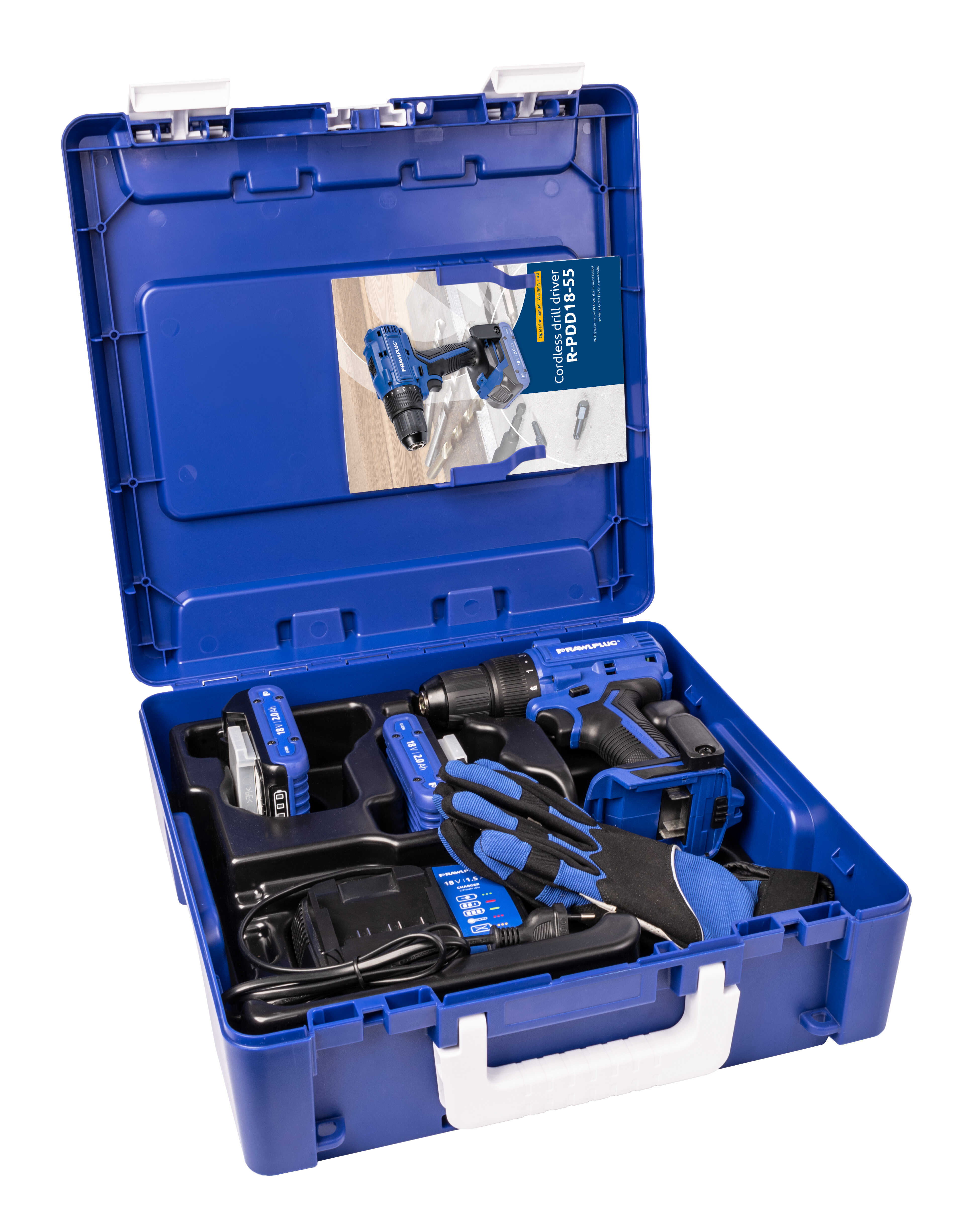 Setul (R-PDD18-55-M2) include 2 acumulatori Li-Ion cu o capacitate de 2.0 Ah și un încărcător rapid de 60 de minute care garantează continuitatea lucrărilor, fără întrerupere